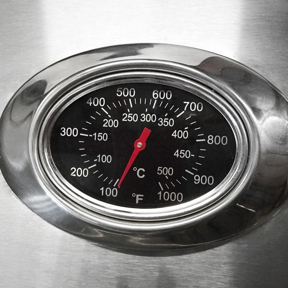 An analog thermometer with polished stainless steel bezel is embedded in the hood. It is large and attractive with a forward angle for easy viewing.