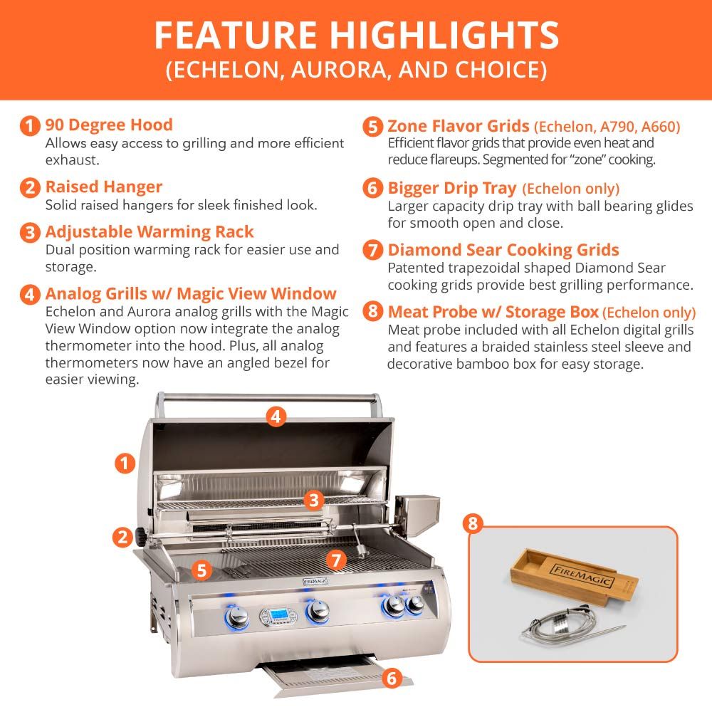 Echelon drip tray: Built with ball bearings for easy glide. Perfect size for easy handling. Use with Fire Magic drip tray liners for convenient cleanup. A chrome analog thermometer with meat probe is included, digital thermometer upgrade available which provides a state-of-the-art electronic thermometer display, with meat probe, and has an impressive array of features.